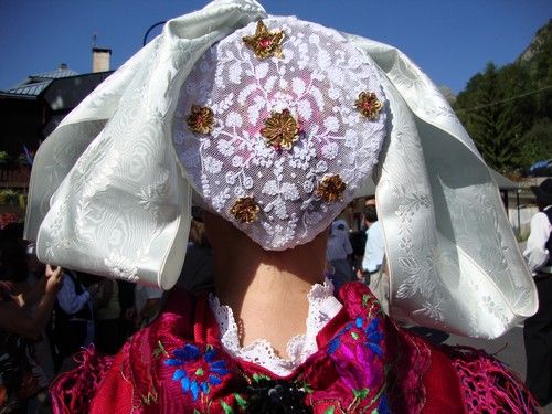 L'un des plus riches de Maurienne, son corselet rehaussé de galons et de paillettes, ses boutonnières sont brodées et des boutons rutilants. La robe, très plissée, est doublée de bandes de drap bleu, la haute ceinture, le large ruban de soie, les lourds bijoux d'argent évoquaient, pour Félix Germain, "des princesses barbares émergeant de temps révolus".